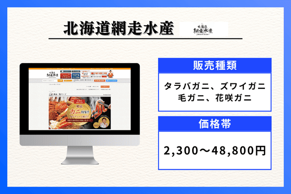 | 4位 | 北海道網走水産 | タラバガニ、ズワイガニ、毛ガニ、花咲ガニ | |