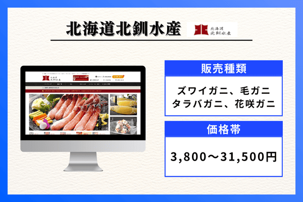 | 販売種類 | タラバガニ、ズワイガニ、毛ガニ、花咲ガニ |